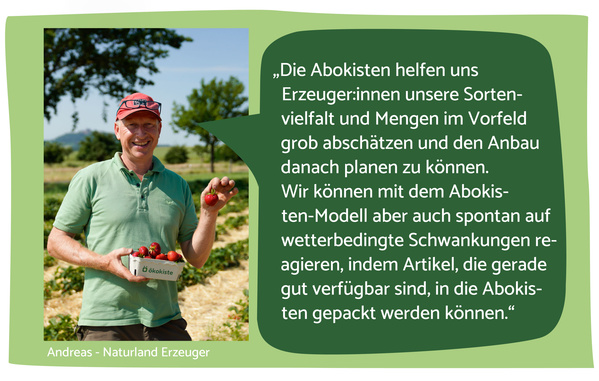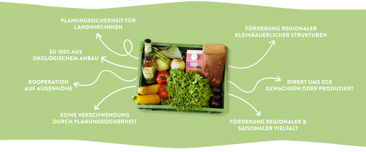 Als Mitglied im Verband Ökokiste e. V. loben wir nur diejenigen Produkte als regional aus, die im Umkreis von 200 km erzeugt werden. Bei über 90 % der regionalen Lieferanten unterschreiten wir diesen Richtwert um mehr als die Hälfte. Wir zahlen unseren Direktlieferant:innen Preise, die sich am Großhandel orientieren. Da aber ohne den Großhändler ein zusätzlicher Zwischenhändler wegfällt, zahlen wir somit überdurchschnittliche Preise. Durch diese fairen Preise unterstützen wir gerne auch kleinere Familienbetriebe, die ihre Landwirtschaft häufig mit weniger modernen Maschinen und dadurch mit zusätzlichem Arbeitsaufwand betreiben. Diese Preisstrategie sehen wir als ein Werkzeug, Vielfalt in unserer Region zu erhalten.