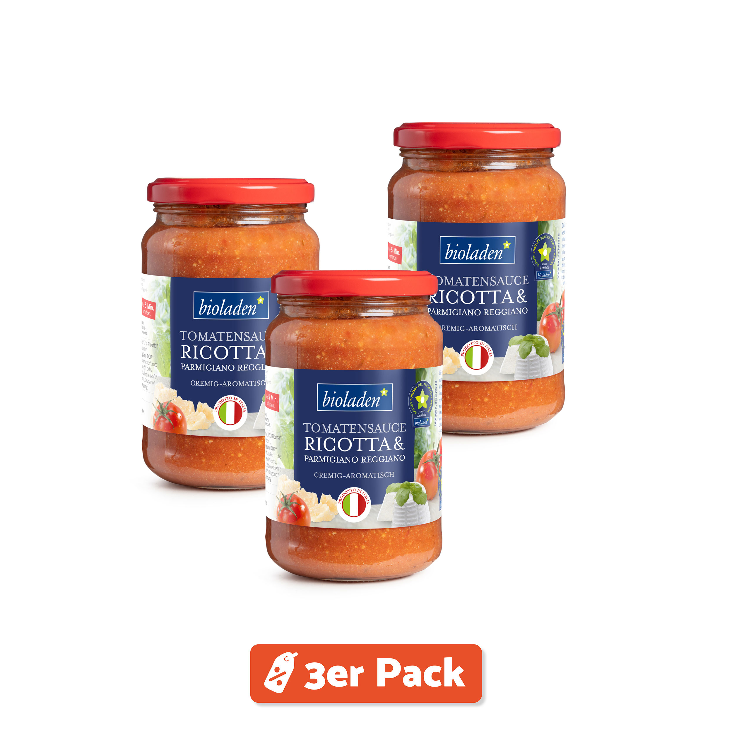 Die Tomaten für die bioladen*Produkte werden von Bio-Bauern in Italien unter besten klimatischen Bedingungen angebaut.Auf ihren ökologisch bewirtschafteten Feldern reifen die -pomodori- zu sonnenverwöhnten aromatischen Früchten heran. Nach original italienischen Rezepten werden die Tomaten von einem Familienbetrieb in der Region Latium zu etwas ganz Besonderem verfeinert -unseren Tomatensaucen. (mit Ricotta & Parmesan)