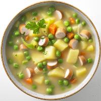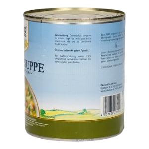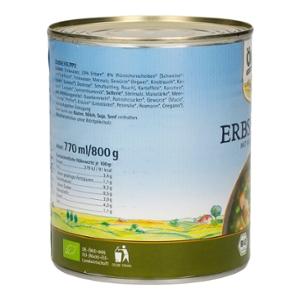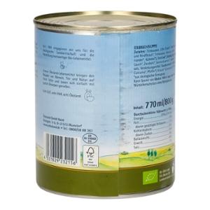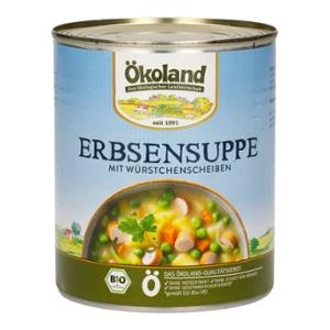 Trinkwasser, 23% Erbsen*, 8% Würstchenscheiben* [Schweine*- und Rindfleisch*, Trinkwasser, Meersalz, Gewürze* (Ingwer*, Knoblauch*,