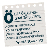 Unsere Ökoland-Lebensmittel sollen auch zu Ihrer Lebensfreude beitragen. Die Qualität von Bio-Rohstoffen und deren Verarbeitung steht für uns im Mittelpunkt. Wir verstecken keine Zusatzstoffe, wir verzichten auf sie, wo immer es geht. So können Sie mit reinem Gewissen genießen. Unsere Landwirte halten die Tiere nach Bio-Richtlinien und artgerecht und sorgen dafür, dass auch sie das Leben genießen können. Dass sie dennoch geschlachtet werden, ist für uns kein Widerspruch. Wer das ablehnt, für den haben wir auch vegetarische und vegane Produkte im Angebot.