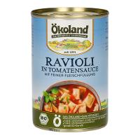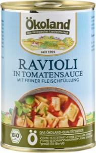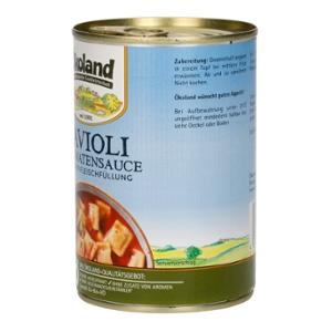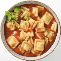 Trinkwasser, 18% Ravioli* (HARTWEIZENGRIEß*, 12% Schweinefleisch*, HAFERFLOCKEN*, Sonnenblumenöl*, Meersalz) (Trockeneinwaage), Tomatenmark*,