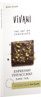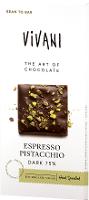 Kakaomasse*, Kokosblütenzucker* 23%, Kakaobutter*, Kakaopulver*, 6% gesalzene, gehackte PISTAZIEN (PISTAZIEN*, Meersalz), Espressopulver*