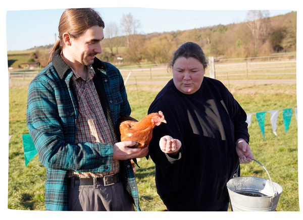 Janina und Benedikt haben sich dagegen entschieden, den Betrieb auf die wirtschaftlich lohnenswerte Eierproduktion zu beschränken. Denn dass normalerweise lediglich die Hennen groß gefüttert werden, die männlichen Küken jedoch in den Schredder kommen, das finden die Saßmann-Königs völlig absurd und nicht tragbar. Diese verbreitete Handhabe liegt darin begründet, dass manche Rassen darauf ausgelegt sind, viele Eier zu legen, aber wenig Masse ansetzen. Eine andere Rasse, die normalerweise für die Fleischproduktion genutzt wird, legt schneller an Masse zu, die weiblichen Pendants legen jedoch wirtschaftlich gesehen zu wenige Eier. Hier in der Riedmühle herrscht ein ganzheitliches Prinzip: Janina und Benedikt haben sich hinsichtlich der Rasse für einen Kompromiss entschieden. Zwar halten die Saßmann-Königs die lege-starken Hybridrassen für die Eierproduktion, jedoch lassen sie durch die Bruderhahn-Initiative, Bruderhähne, also männliche Küken aufziehen und vermarkten.