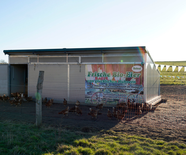 Die Hühner der Riedmühle leben genau so, wie man es sich vorstellt: gackernde Hennen, die auf der Wiese herumlaufen und beschützt werden von ihren Hähnen, die Gras rupfen, in der Erde picken und Staubbäder nehmen. Darüber hinaus führen die Hühner von Janina und Benedikt das wohl beflügelndste Leben überhaupt, denn sie leben im Hühnermobil, das wöchentlich von Wiese zu Wiese zieht. Und das ist gut für Land und Tier: Der Boden wird durch die Ausscheidungen der Hühner gedüngt, aber nicht zu hoch belastet und die Hühner selbst wiederum sehen etwas von der Welt und freuen sich immer wieder über frische Wiesen. Echte Weltenbummler-Hühner eben.