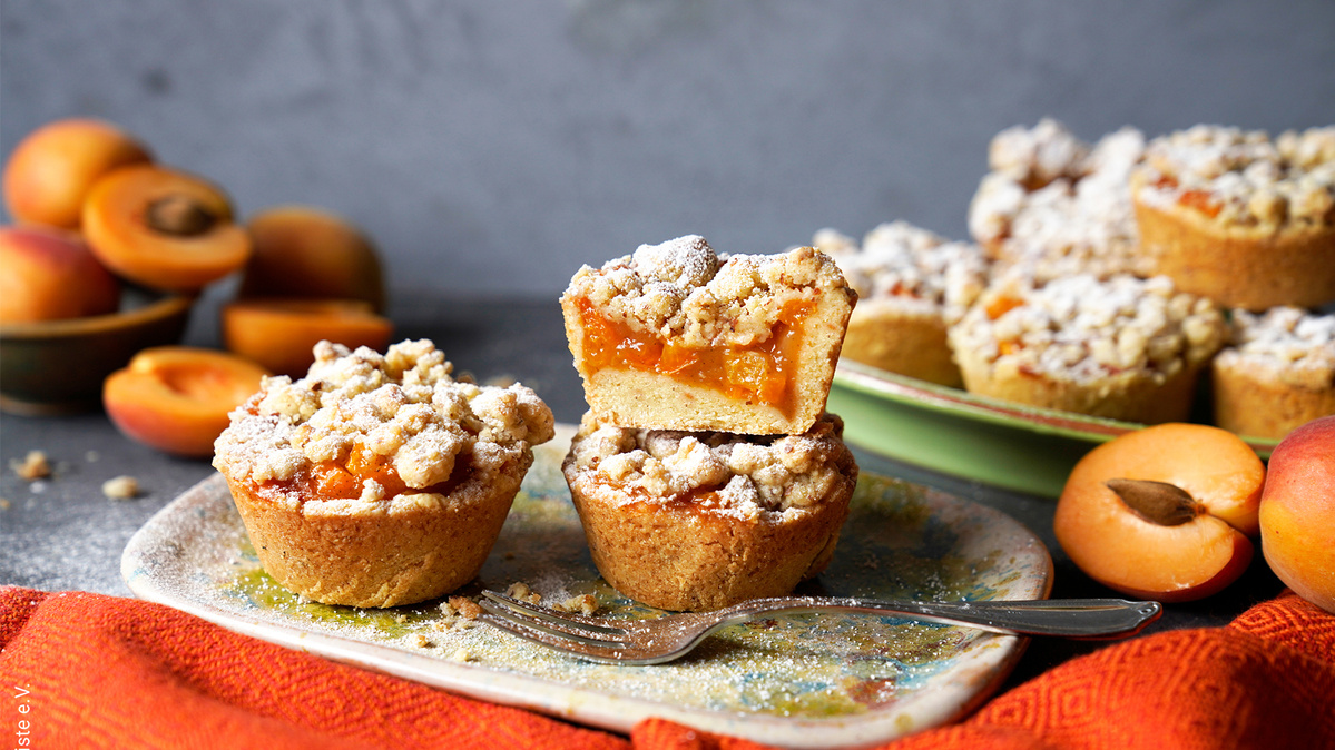 Die Küchlein aus Mürbeteig, Aprikosen- Puddingfüllung und Streuseln schmecken sommerlich fruchtig.