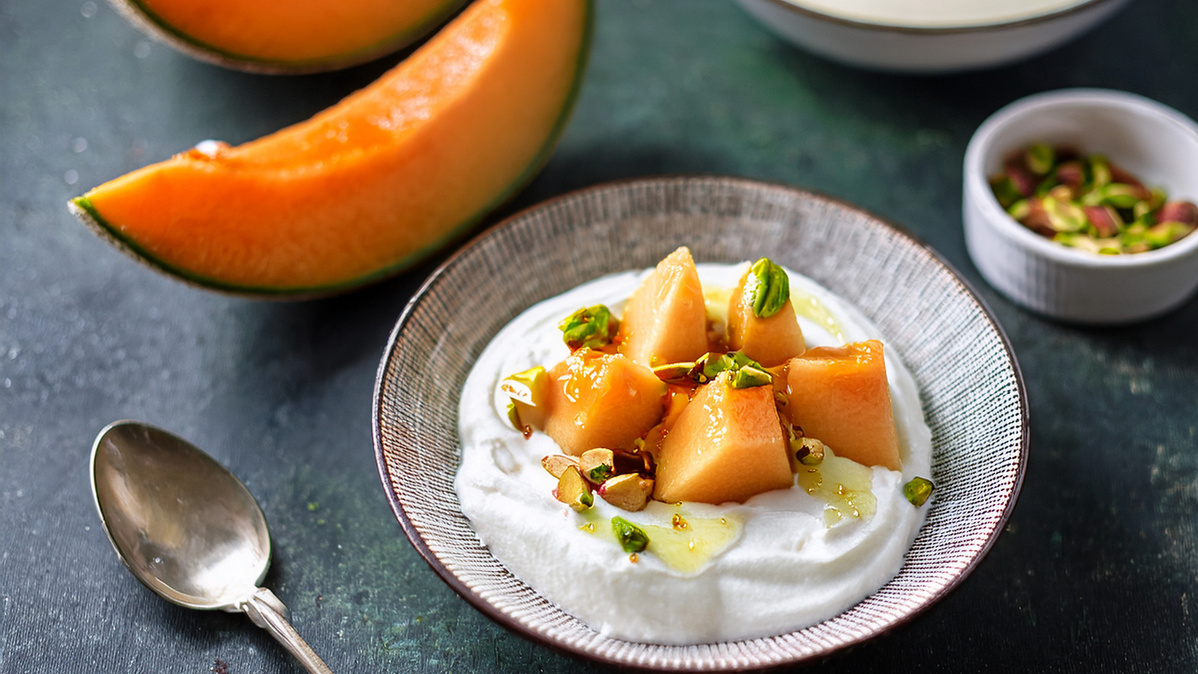 Cantaloup-Melone mit Rahmjoghurt und Honig-Pistazien