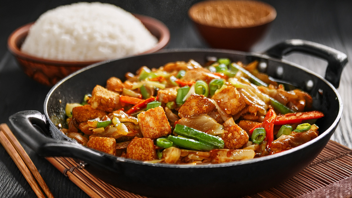 Reis in kochendem Salzwasser nach Packungsanweisung garen. Zwiebeln schälen, würfeln. Kohl putzen, waschen und den Strunk entfernen. Kohl in grobe Stücke schneiden. Sojaschnetzel nach Packungsanweisung quellen lassen.