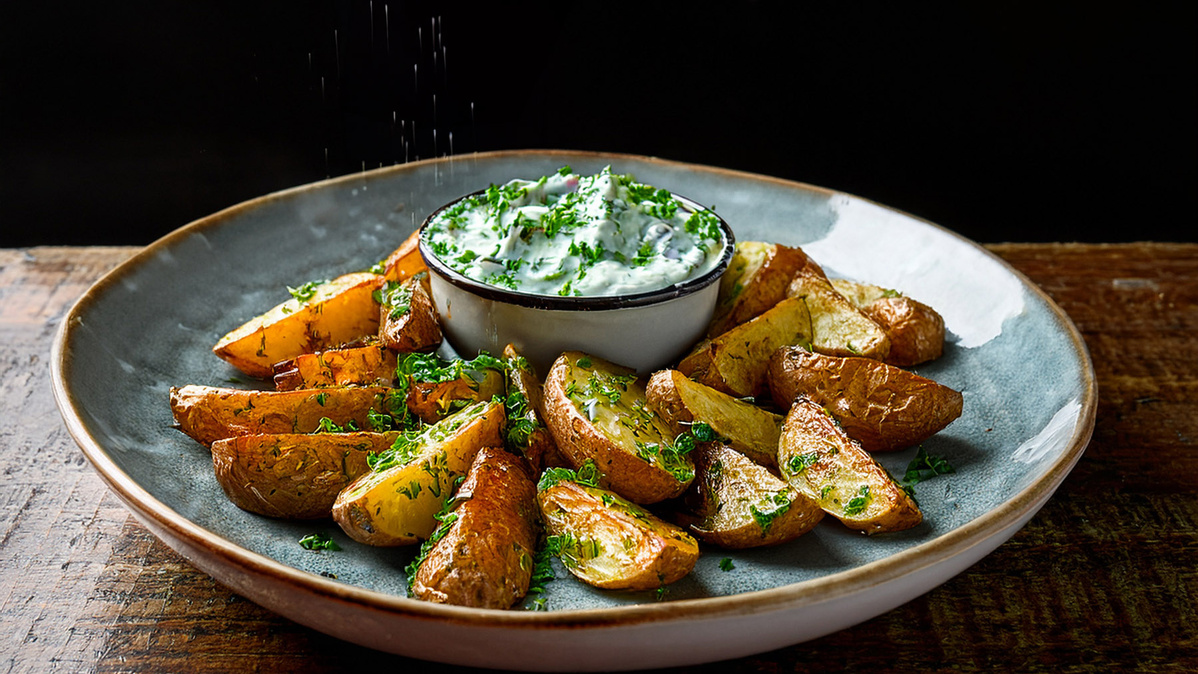 Backe die Kartoffeln bei 180 °C für 30 - 40 Minuten, bis sie goldgelb und knusprig sind. Platziere sie auf einem Teller und salze sie nochmals ganz leicht.