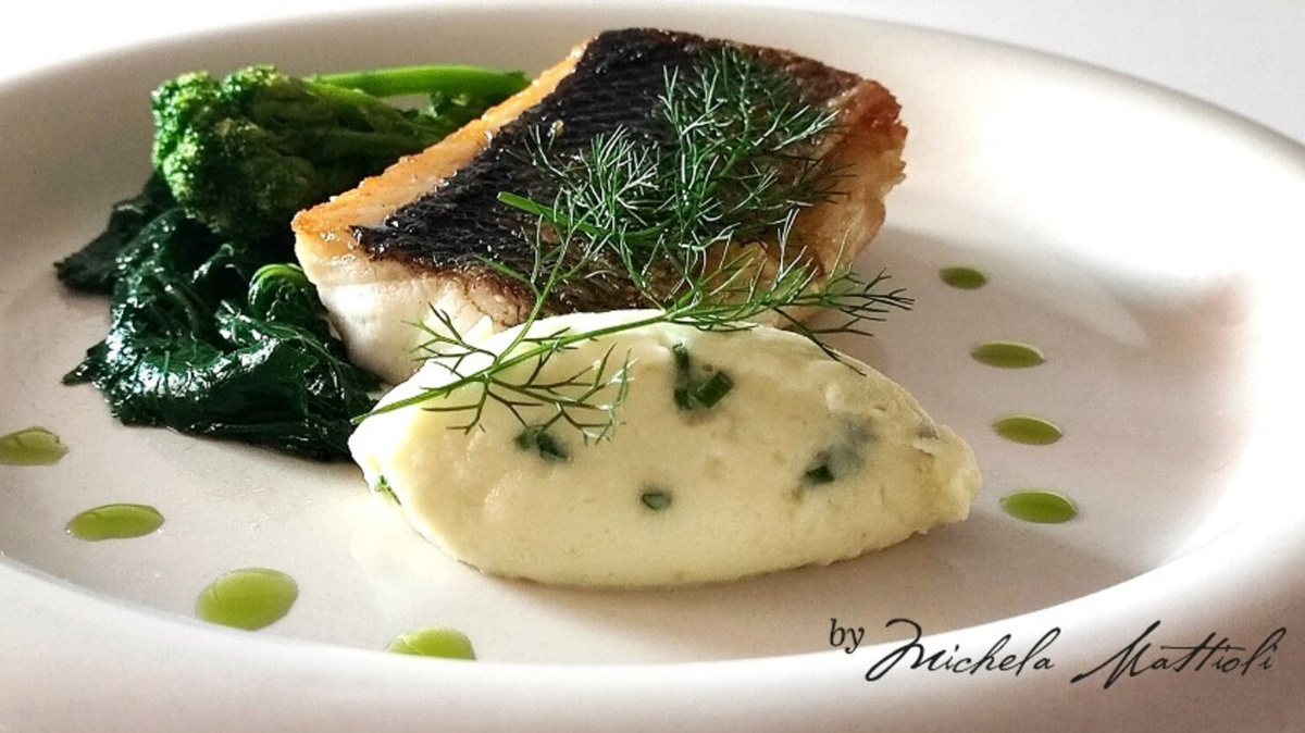 Den sautierten Cime di Rapa auf einem Teller anrichten und eine Nocke des Kartoffel-Gorgonzola-Pürees danebensetzen.