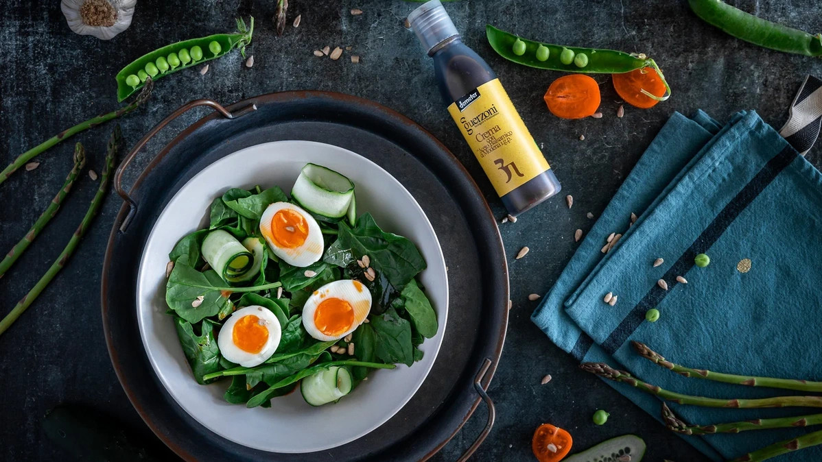 Den Salat anrichten: Den Babyspinat auf dem Teller verteilen, die halbierten Eier, Erbsen, Gurkenspiralen und Sonnenblumenkerne hinzufügen. Mit etwas Olivenöl, einer Prise Salz und ein paar Tropfen Guerzoni Balsamico-Creme verfeinern.