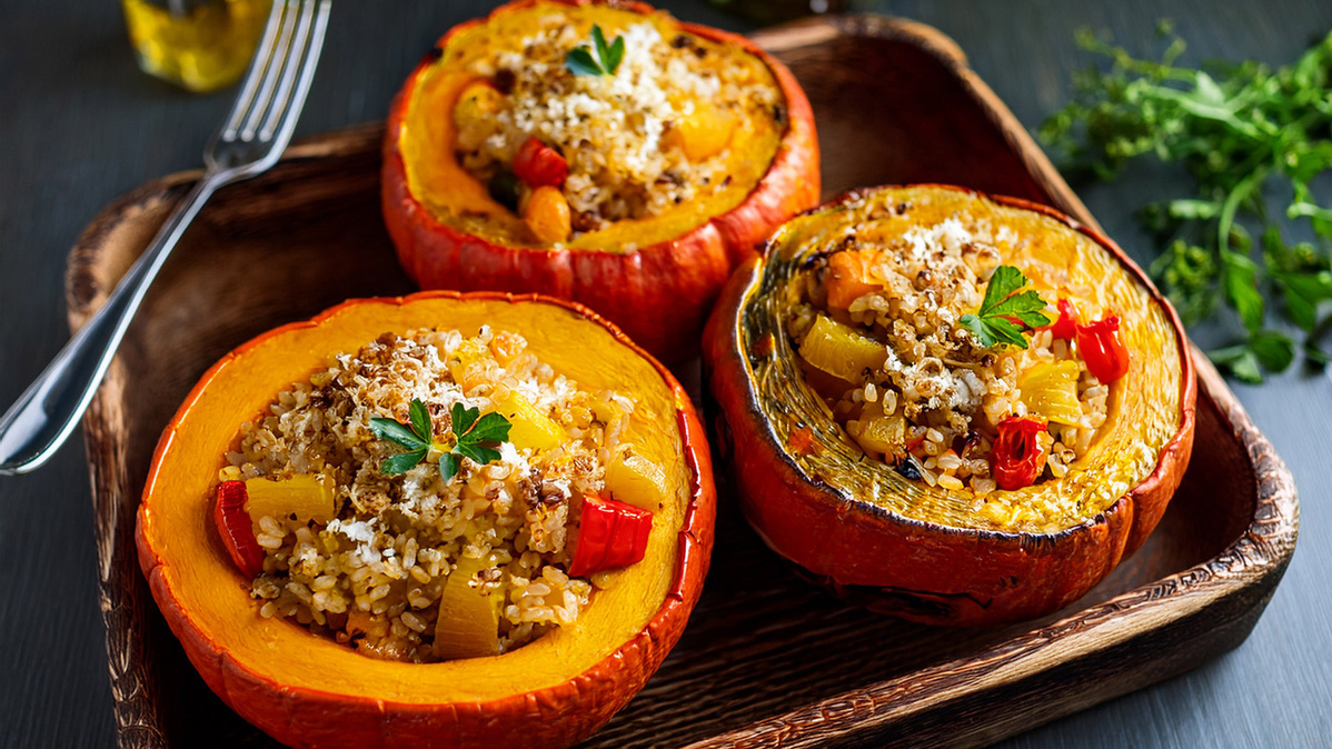 Die Kürbisse putzen, längs halbieren, die Kerne und Fasern entfernen und die Reismischung in die Kürbisse füllen. Die Semmelbrösel über den Reis verteilen und mit 1 EL Öl beträufeln.
