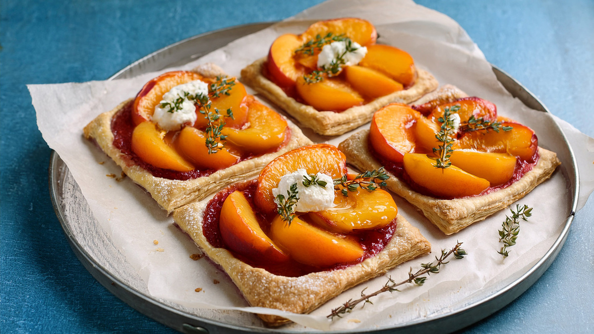 Nektarinen würfeln, Manouri in Stückchen brechen und mit dem Fruchtaufstrich vermengen. Alle Zutaten auf den Blätterteig geben und bei 200 °C im Backofen in ca. 8 - 12 Minuten goldbraun backen.