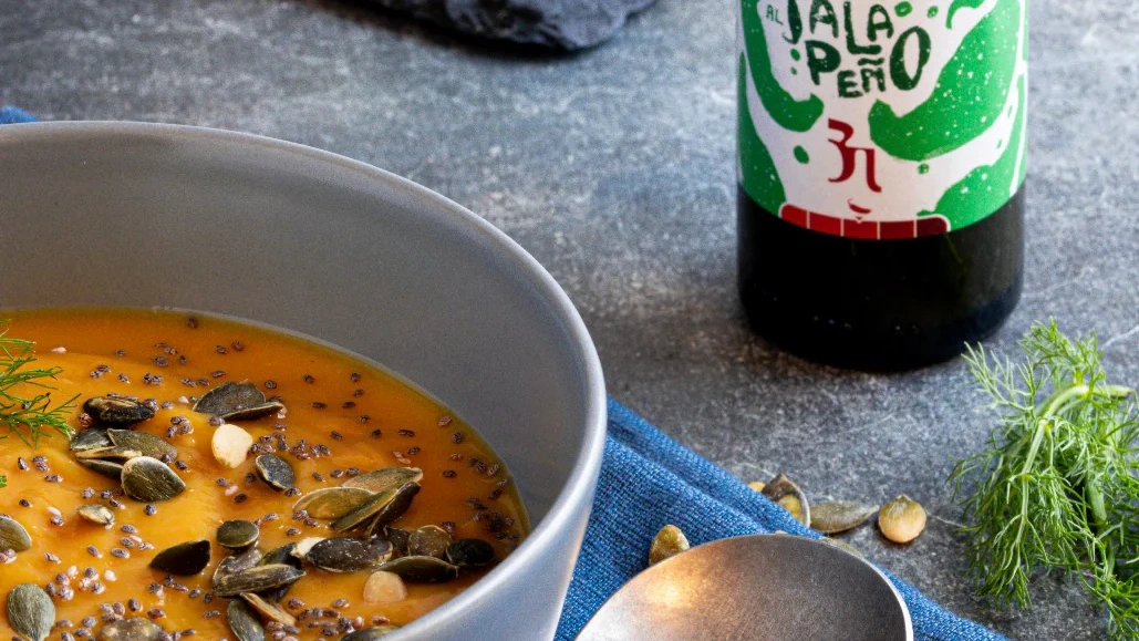Die Kürbis-Möhren-Creme mit frischer Ricotta und Grüner Jalapeño-Sauce sofort servieren, vielleicht mit gerösteten Brotscheiben oder Grissini für einen knusprigen Touch.
