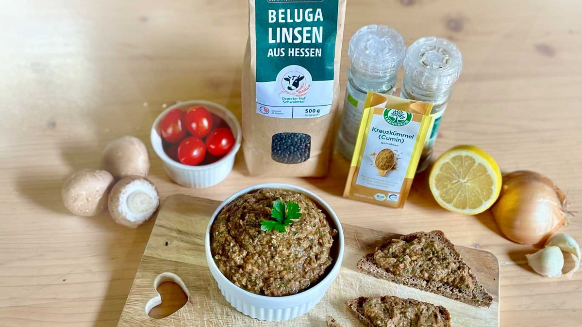 Das Kokosöl in eine heiße Pfanne geben. Zwiebeln, Knoblauch und Champignons hinzugeben und 10 Minuten anschwitzen. Mit Salz würzen, vom Herd nehmen und leicht abkühlen lassen. Mit Tomaten und Linsen vermengen und mit Kreuzkümmel, Salz und Pfeffer abschmecken. Pürieren, dabei nach und nach das Öl beifügen.