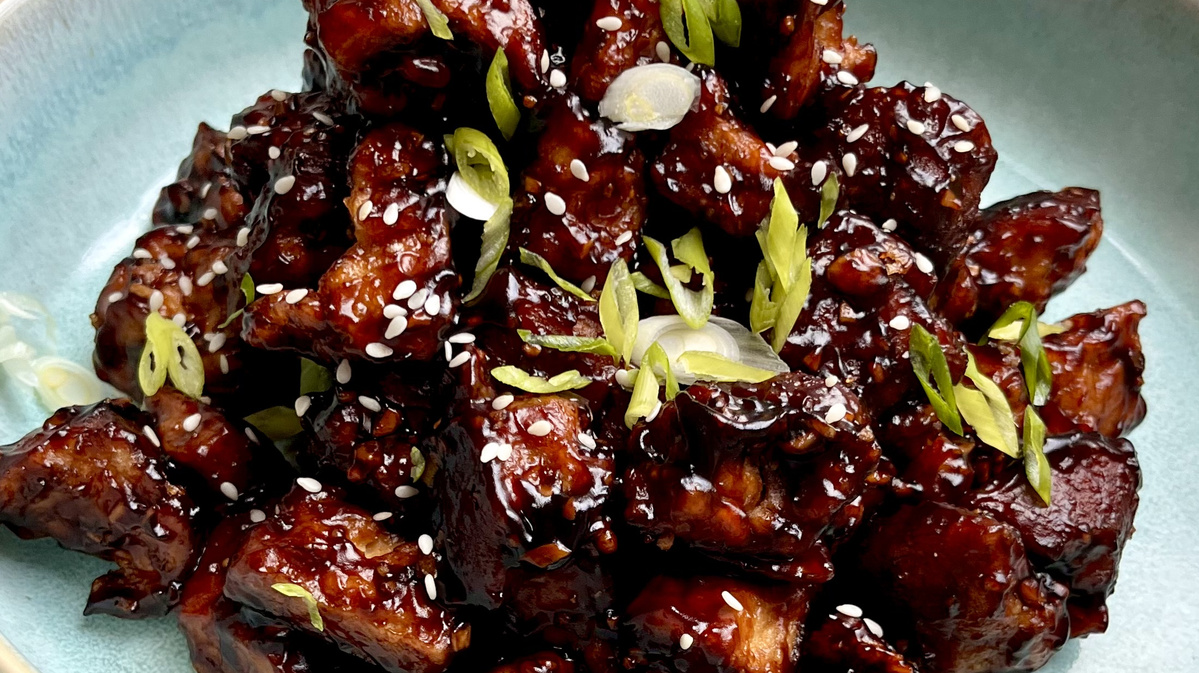 Zuerst wird der Tofu in grobe Stücke zerrissen, um eine Struktur entstehen zu lassen. Danach wird der Tofu mit 2 EL Kartoffelstärke gut vermengt, sodass an allen Stellen die Stärke hängen bleibt. Eine Pfanne mit Öl erhitzen und die panierten Tofustückchen scharf anbraten.