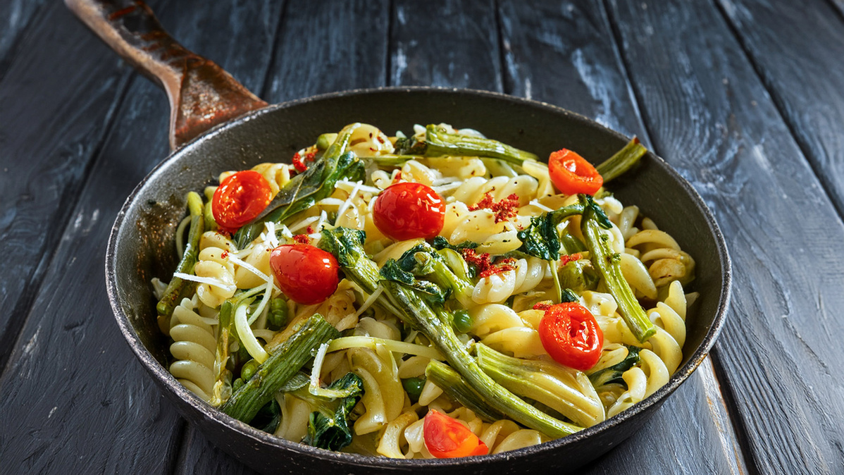 Parallel die Pasta kochen, tropfnass in die Pfanne geben und mit dem Gemüse vermengen. Gegebenenfalls noch etwas Nudelwasser oder Brühe hinzufügen.