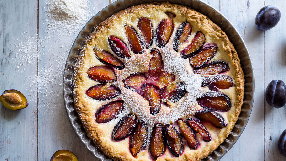 Für den Teig Mehl, 100 g Butter in Stückchen, 50 g Zucker, 1 Prise Salz und 2 EL kaltes Wasser erst mit den Händen, dann mit den Knethaken des Rührgeräts rasch zu einem glatten Teig verkneten. In Folie wickeln und ca. 1 Stunde kalt stellen. Pflaumen waschen, halbieren, entsteinen und je nach Größe halbieren oder in breite Spalten schneiden. Backofen vorheizen (E-Herd: 200 °C/Umluft: 175 °C). Mascarpone, Eigelb und Vanillezucker verrühren. 1 EL Mandeln grob hacken, restliche Mandeln fein mahlen.
