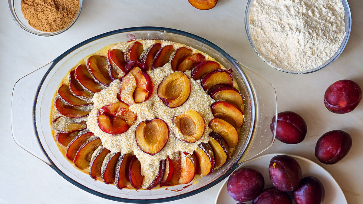 Eine Backform fetten und mit Semmelbröseln bestäuben. Den Teig in die Form geben und glattstreichen. Die Pflaumen dicht an dicht in den Teig drücken und in den vorgeheizten Backofen geben. Wer mag kann den Teig auch in Muffinförmchen backen. Dazu das Förmchen ca. halbvoll mit Teig füllen und 6 Pflaumenhälften kreisförmig in den Teig drücken.