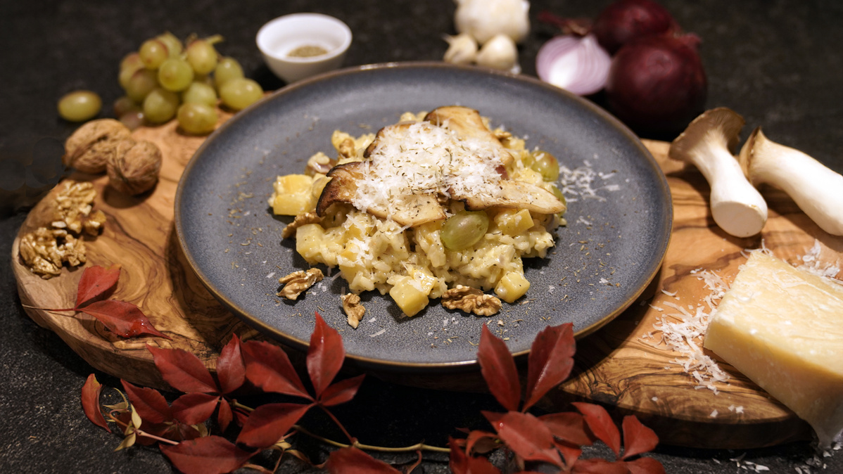 Trauben halbieren und unterheben. Das Risotto kurz ruhen lassen.