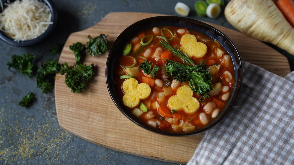 Minestrone mit Polenta, Grünkohl-Chips und geriebenem Parmesan servieren.