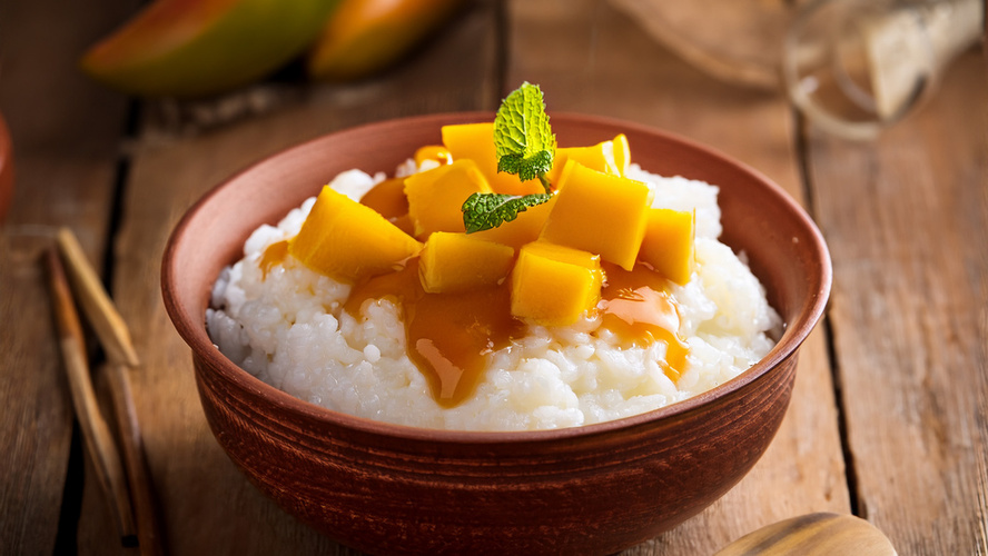 Milchreis mit Mangopüree und Karamell